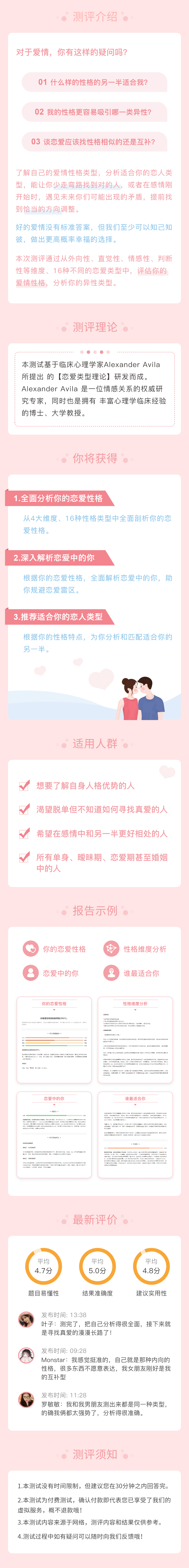 本测评以迈尔斯布里格斯类型指标 (MBTI) 和临床心理学家Alexander Avila的恋爱类型理论并基于中国文化背景,访谈大量已婚、恋爱中、单身人群的行为数据,从性格维度结合爱情气质理论中的四种类型,帮你发现你的理想恋人画像。