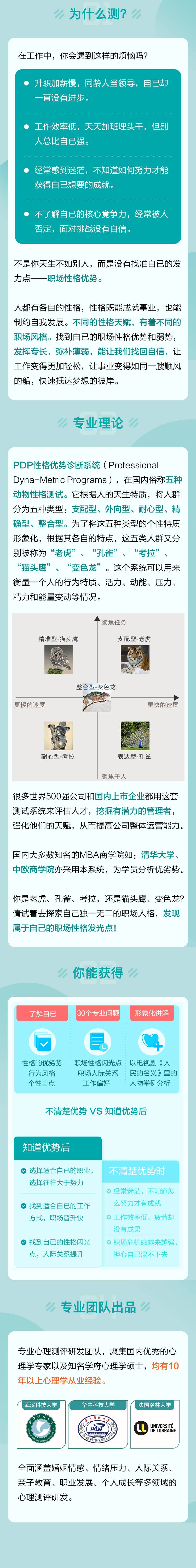 PDP性格优势诊断系统(ProfessionalDyna-Metric Programs),在国内俗称五种动物性格测试。它根据人的天生特质,将人群分为五种类型:支配型、外向型、耐心型、精确型、整合型。为了将这五种类型的个性特质形象化,根据其各自的特点,这五类人群又分别被称为“老虎”、“孔雀”、“考拉”、“猫头鹰”、“变色龙”。这个系统可以用来衡量一个人的行为特质、活力、动能、压力、精力和能量变动等情况。